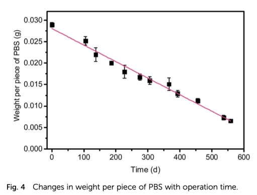 2 PBS降解速率和消耗量數據:通過重量變化測量PBS降解速率,計算PBS消耗量,來自圖4。研究意義是顯示PBS降解線性進行(約0.04 mg/天),消耗量略高于理論值,表明需定期補充碳源,為經濟性評估提供數據。