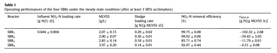 1 NO2-N去除效率和反硝化速率數(shù)據(jù):測量了不同碳源下NO2-N去除效率(99.75%、99.92%、85.71%、92.47%)和反硝化速率(102.32、59.43、11.79、6.51 mg N/(g MLVSS·h)),來自表1。研究意義是證實(shí)簡單有機(jī)碳促進(jìn)高效反硝化,而復(fù)雜碳源導(dǎo)致速率降低,為碳源選擇提供依據(jù),以優(yōu)化脫氮效率。