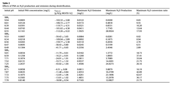 3 FNA對N2O轉(zhuǎn)化率影響數(shù)據(jù):分析了初始FNA濃度(0.0003-2.2637 mg/L)與N2O轉(zhuǎn)化率(最高62.67%)的關(guān)系,來自表2。研究意義是揭示FNA抑制N2O還原酶活性,導(dǎo)致N2O積累,為調(diào)控pH和亞硝酸鹽濃度以降低排放提供理論依據(jù)。