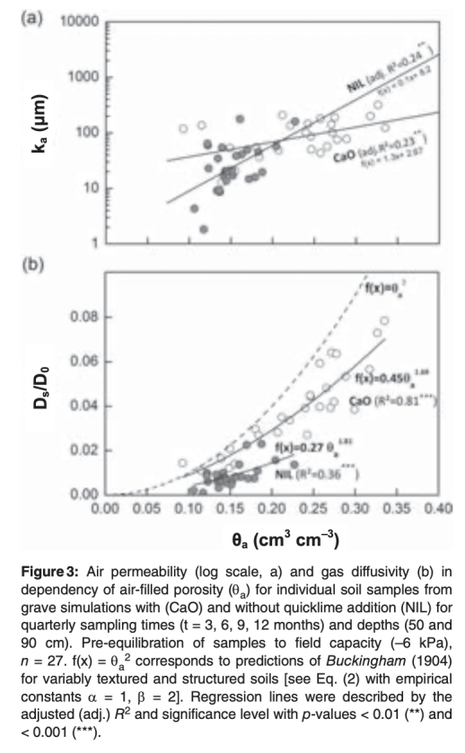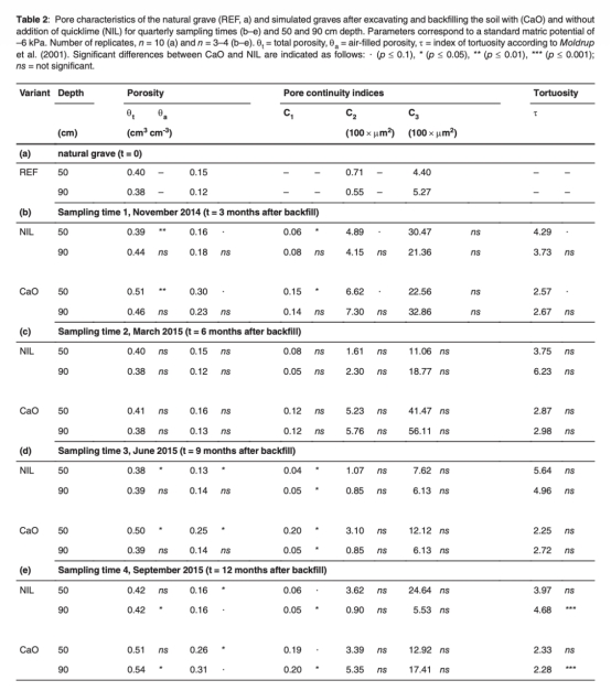 研究在德國北部的墓地上挖了兩個(gè)模擬墓坑(無遺體):一個(gè)添加生石灰(CaO),一個(gè)不添加(NIL)。土壤類型為Terric Anthrosol (Stagnic),質(zhì)地為壤質(zhì)沙土。在回填前和回填后每隔3個(gè)月取樣,分析氣體傳輸功能(空氣填充孔隙度、空氣滲透性、氣體擴(kuò)散性)和土壤呼吸(代表微生物活性)。使用未擾動(dòng)土芯進(jìn)行實(shí)驗(yàn)室測量,包括空氣滲透性、氣體擴(kuò)散性和呼吸率,并進(jìn)行統(tǒng)計(jì)比較。