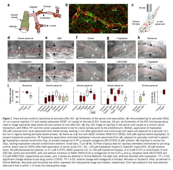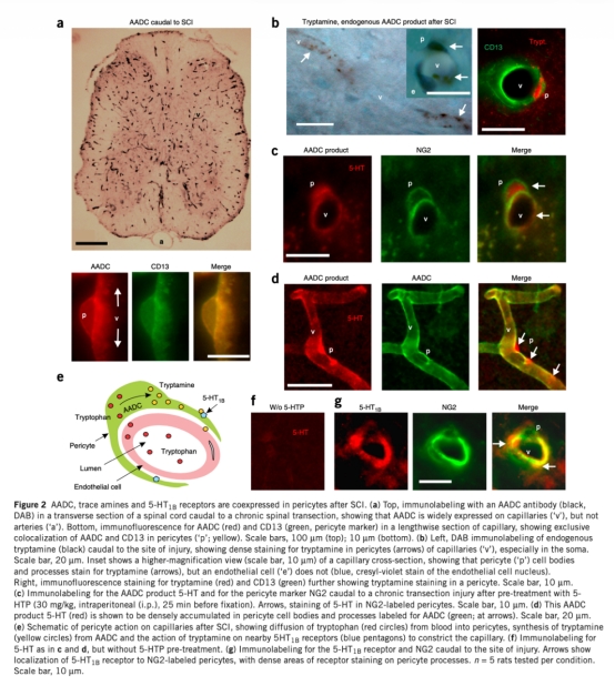 論文摘要指出,中樞神經(jīng)系統(tǒng)血管受神經(jīng)元活動控制,脊髓損傷后,損傷部位以下的脊髓因單胺神經(jīng)支配丟失,導(dǎo)致血管張力適應(yīng)異常。研究發(fā)現(xiàn),慢性脊髓損傷后,脊髓處于慢性缺氧狀態(tài),原因是周細(xì)胞上單胺受體(如5-HT1B)在缺乏單胺的情況下被痕量胺(如色胺)過度激活,導(dǎo)致毛細(xì)血管收縮,血流減少至缺血水平。痕量胺由周細(xì)胞異位表達(dá)的芳香族L-氨基酸脫羧酶(AADC)從飲食氨基酸(如色氨酸)合成。抑制單胺受體或AADC,或增加吸氧,可緩解缺氧并改善運(yùn)動神經(jīng)元和運(yùn)動功能。