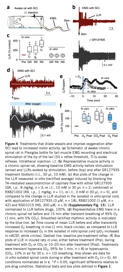 4 運(yùn)動功能數(shù)據(jù)來自Fig.4,通過EMG記錄自發(fā)活動和感覺誘發(fā)反射,顯示受體拮抗劑或高氧吸入增加EMG活動和運(yùn)動爆發(fā),研究意義是表明改善血流和氧氣供應(yīng)可增強(qiáng)運(yùn)動輸出。
