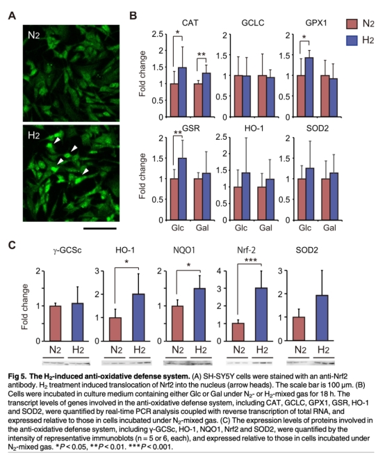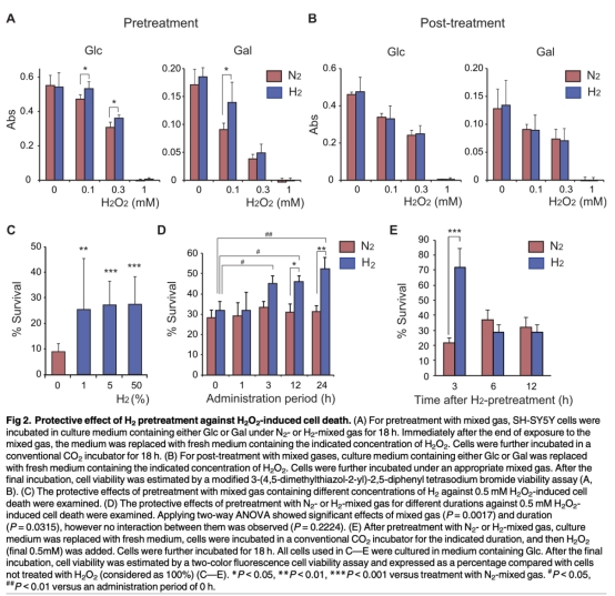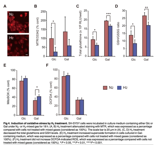 吸入分子氫氣體可改善氧化應激誘導的急性腦損傷。飲用近飽和氫水也能在動物和臨床研究中預防包括帕金森病在內(nèi)的慢性神經(jīng)退行性疾病。然而,少量H2產(chǎn)生顯著效應的分子機制尚不清楚。本研究探討了H2對培養(yǎng)的人神經(jīng)母細胞瘤SH-SY5Y細胞中線粒體的影響。H2增加了線粒體膜電位和細胞ATP水平,同時伴隨著還原型谷胱甘肽水平的降低和超氧化物水平的升高。用H2預處理可抑制H2O2誘導的細胞死亡,而事后處理則無效。H2處理細胞中Nrf2通路下游抗氧化酶表達的增加表明,H2引起的輕度應激增強了細胞對加劇的氧化應激的抵抗力。我們提出H2在細胞中既作為自由基清除劑,又作為對抗氧化應激的線粒體興奮效應劑。