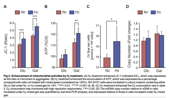 5. 線粒體DNA拷貝數(shù):通過實時定量PCR測量。數(shù)據(jù)展示在Figure 3D中。研究意義:該數(shù)據(jù)表明H2增強的線粒體功能并非通過增加線粒體數(shù)量實現(xiàn),而是通過提高單個線粒體的活性。