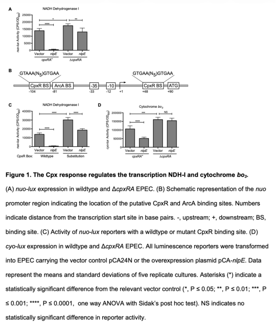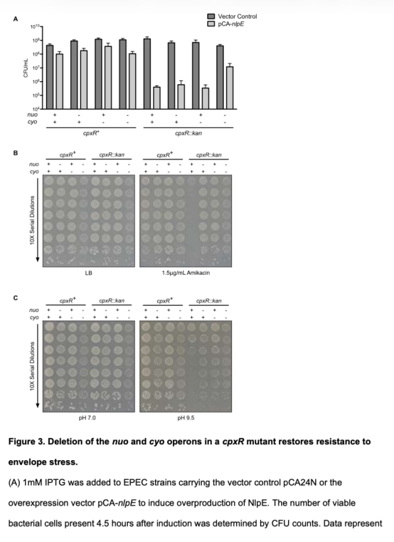 3. 應激敏感性數據:通過CFU計數和生長稀釋實驗測量細菌對包膜應激的敏感性,數據顯示cpxR突變體對NlpE過表達、amikacin和堿性pH敏感,但缺失nuo和cyo可部分或完全恢復抵抗力(圖3)。這些數據的研究意義在于證明呼吸復合物在應激條件下具有毒性,Cpx調控這些復合物是適應應激的關鍵機制。數據來自圖3。