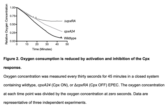 2. 氧消耗數據:使用丹麥Unisense電極測量細菌的氧消耗率,顯示在cpxA24突變體(Cpx持續激活)中氧消耗減少,而在ΔcpxRA突變體(Cpx缺失)中氧消耗也異常降低,盡管轉錄未變(圖2)。這些數據的研究意義在于揭示Cpx反應不僅影響轉錄,還可能影響呼吸復合物的組裝、穩定性或功能,表明Cpx在蛋白質質量控制中發揮作用。數據來自圖2。