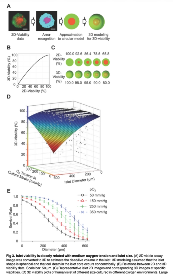 4 2D和3D存活率轉換數據:將2D存活率數據轉換為3D體積模型,顯示3D存活率高于2D評估。散點圖分析1278個胰島,顯示胰島直徑和氧張力協同影響存活,來自圖3A-3D和表2。研究意義在于更準確評估真實存活情況,突出胰島大小和氧環境的關鍵作用。