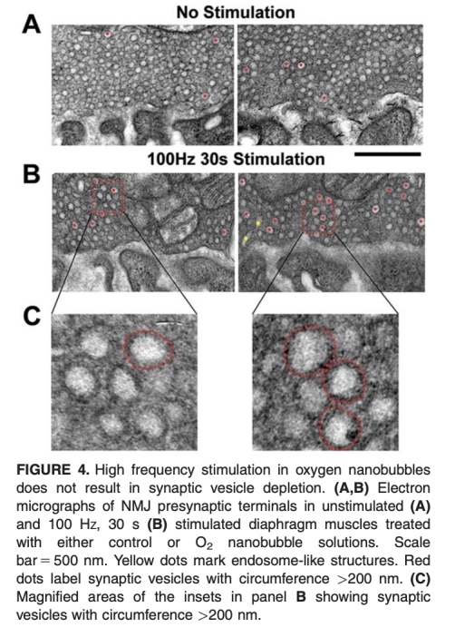 4 突觸形態變化:高頻刺激后氧納米氣泡處理組出現大突觸小泡和內涵體樣結構積累,提示內吞作用增強,可能與能量代謝改善相關。數據來自圖4和圖5。