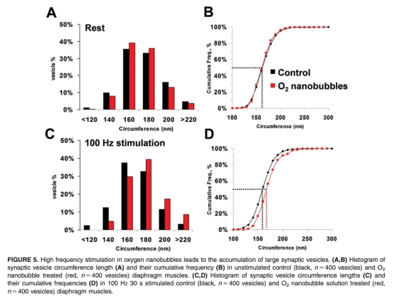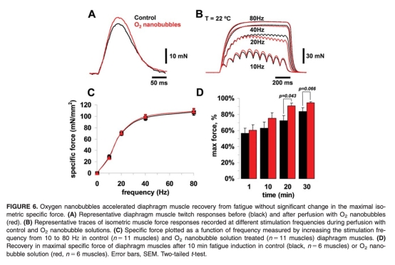 這篇論文研究了氧納米氣泡對小鼠膈肌神經肌肉接頭傳遞和肌肉功能的影響。摘要表明,氧納米氣泡提供了一種新的組織氧合方法。研究發現,在超級灌注氧納米氣泡溶液時,高頻神經刺激減緩了神經傳遞下降,增加了誘發的終板電位振幅和量化內容,但不影響自發性活動。電鏡顯示氧納米氣泡處理后的神經肌肉接頭積累了大的突觸小泡和內涵體樣結構。氧納米氣泡溶液對等長肌肉力無影響,但顯著降低了神經刺激肌肉的疲勞性和最大力恢復時間。結論是氧納米氣泡能增強神經傳遞并減少肌肉疲勞中神經傳遞失敗的概率。