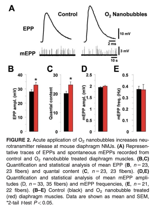 2 單脈沖刺激下終板電位振幅和量化內容增加:氧納米氣泡溶液增加了單刺激誘發的終板電位振幅和量化內容,提示突觸前神經遞質釋放增強,可能通過提高ATP可用性改善傳遞效率。數據來自圖2。