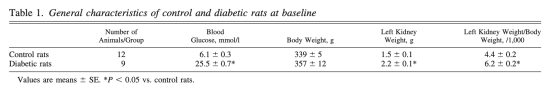 1. 一般動物特征(表1):數據顯示糖尿病動物血糖顯著升高(25.5±0.7 mmol/l vs 對照6.1±0.3 mmol/l),腎重增加,意義在于確認糖尿病模型成功,并顯示糖尿病引起的腎臟肥大,為后續缺氧研究提供基礎。
