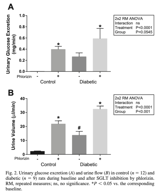 3. 尿葡萄糖排泄(圖2A):SGLT抑制后,對照和糖尿病動物尿葡萄糖排泄均增加,意義在于驗證phlorizin有效抑制SGLT,促進葡萄糖排泄,從而降低血糖。