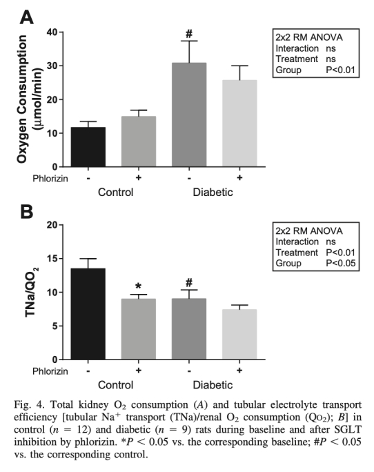 8. tubular Na+ transport/Qo2(TNa/Qo2,圖4B):SGLT抑制降低對照動物的TNa/Qo2,但糖尿病動物無變化,意義在于顯示糖尿病腎臟效率降低,SGLT抑制可能加重能量消耗不平衡。