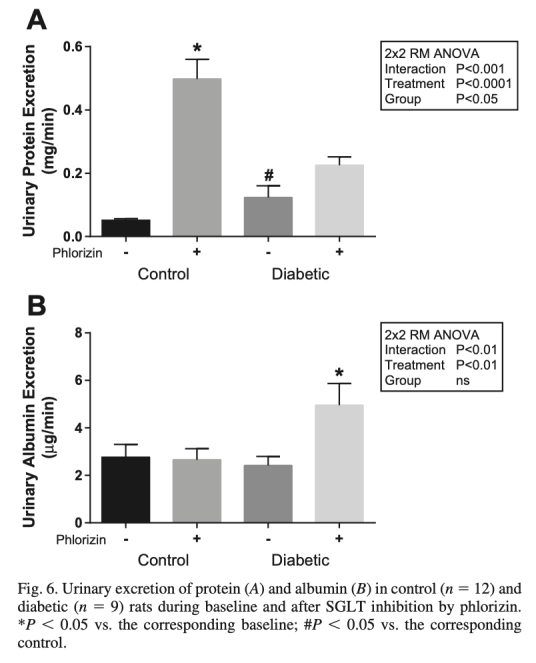 11. 尿蛋白排泄(圖6A)和尿白蛋白排泄(圖6B):SGLT抑制增加對照動物蛋白排泄和糖尿病動物白蛋白排泄,意義在于提示SGLT抑制可能干擾蛋白質重吸收,與利尿相關。
