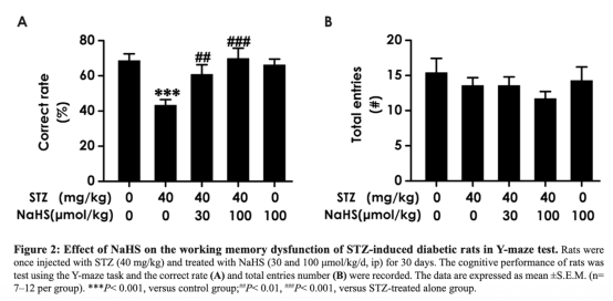2. Y迷宮測試中的正確率(圖2A):糖尿病大鼠正確率下降,NaHS處理顯著提高正確率。研究意義在于顯示H2S能增強工作記憶,支持其改善認知功能障礙的效果。數據來自圖2A。