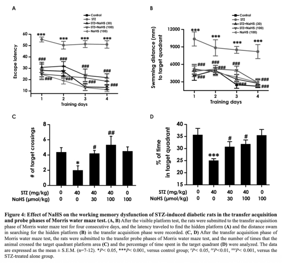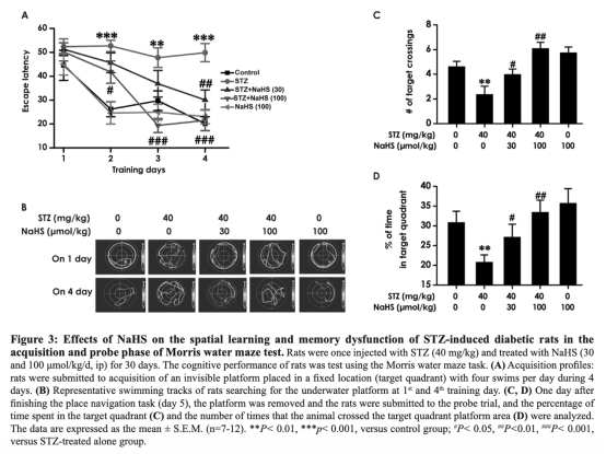 3. Morris水迷宮測試中的逃避潛伏期和游泳距離(圖3A和3B):糖尿病大鼠在訓練期間逃避潛伏期和游泳距離增加,NaHS處理減少這些參數。研究意義在于證明H2S能改善空間學習和記憶,突出了其對海馬功能的積極影響。數據來自圖3A和3B。