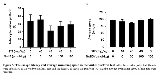 5. 轉移測試中的逃避潛伏期和游泳距離(圖4A和4B):糖尿病大鼠在轉移階段表現差,NaHS處理改善性能。研究意義在于表明H2S能促進工作記憶的適應性。數據來自圖4A和4B。