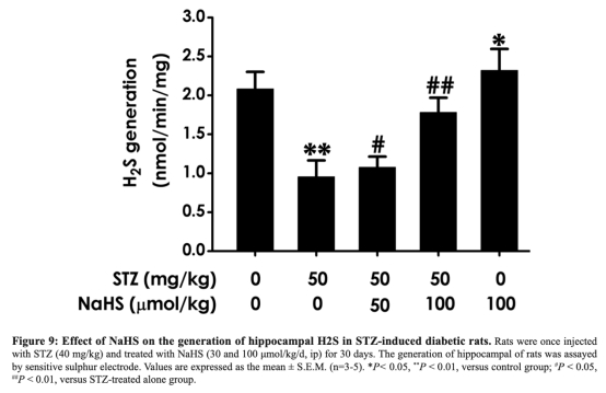 10. 海馬內源性H2S生成(圖9):糖尿病大鼠H2S生成減少,NaHS處理增加H2S生成。研究意義在于直接測量內源性H2S水平,證實NaHS通過增強H2S生物利用度來發揮作用。數據來自圖9。