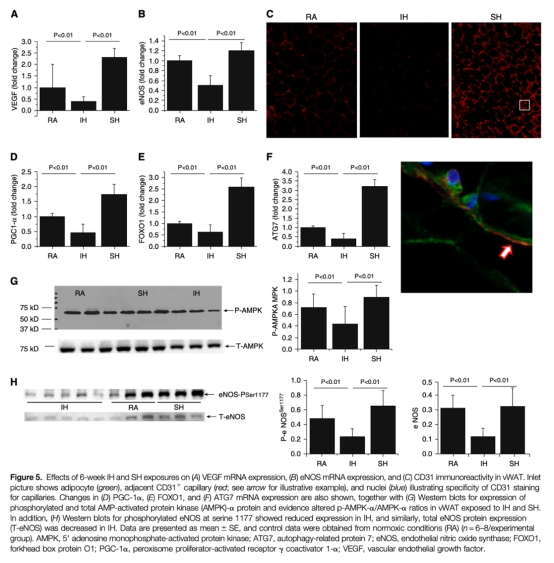 6 血管生成相關指標:IH組VEGF、eNOS表達和CD31+毛細血管密度降低,SH組則升高。研究意義在于證明血管生成差異是代謝功能分化的關鍵。數據來自圖5A-5C。