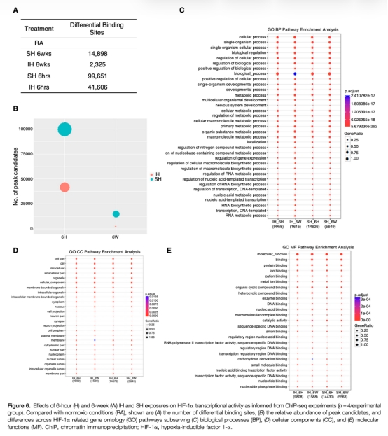 8 HIF-1α轉錄活性:ChIP-seq顯示SH組在6小時和6周時HIF-1α結合位點顯著增加,IH組早期激活但后期消失。研究意義在于明確HIF-1α持續性是決定代謝結局的核心因素。數據來自圖6。