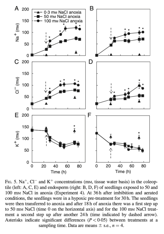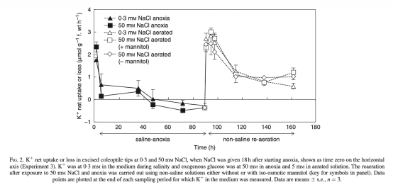 1. 水稻幼苗胚芽鞘能耐受缺氧結合高NaCl(完整幼苗100 mM,外植胚芽鞘50 mM),通過減少生長、降低離子通量和能量經濟型運輸系統實現節能。