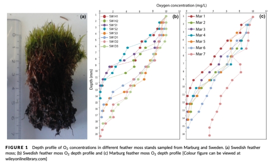 1. 氧氣深度剖面:使用丹麥Unisense氧氣微傳感器測量苔蘚叢中的氧氣濃度,顯示氧氣隨深度減少,底部出現缺氧層。數據來自FIG.1。研究意義是證實苔蘚叢中存在厭氧微環(huán)境,為產甲烷提供必要條件,支持甲烷排放的微生物機制。