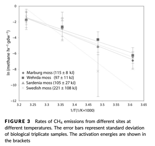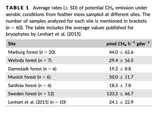 2. 潛在甲烷排放速率:好氧條件下測量甲烷排放速率,范圍19-133 pmol CH4 h-1 gdw-1,不同站點有差異。數據來自Table 1。研究意義是量化苔蘚叢作為甲烷源的強度,表明森林中此類棲息地貢獻小但普遍存在的排放。