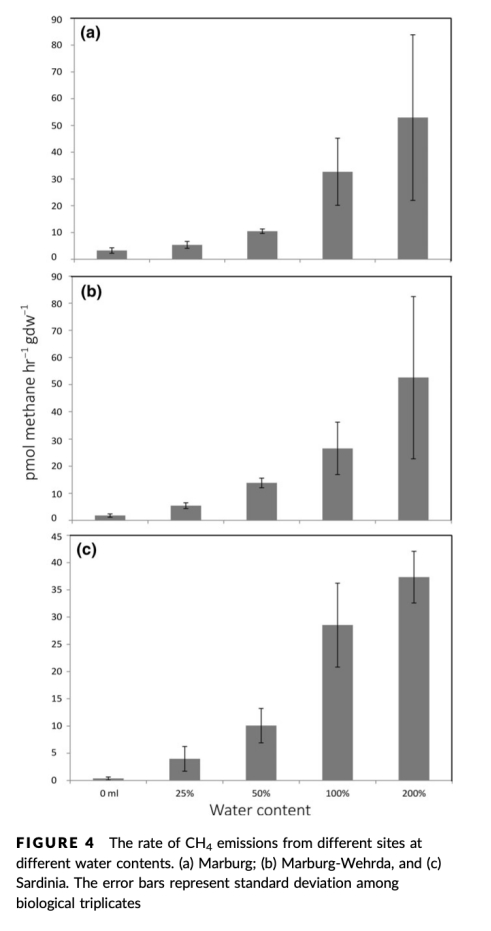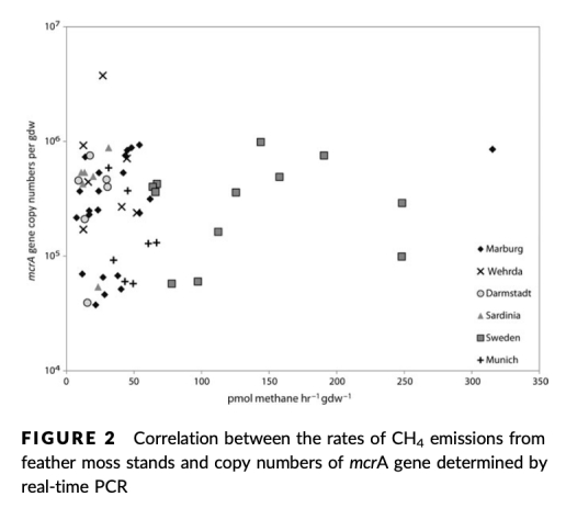 3. mcrA基因拷貝數:通過實時PCR測定,顯示104-105拷貝/g dw,與排放速率無線性相關。數據來自Figure 2。研究意義是評估產甲烷菌豐度,但表明排放受環(huán)境因素而非單純菌群大小驅動。