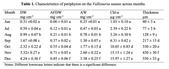 2. 附生生物特性:測量附生生物的干重(DW)、無灰干重(AFDW)、灰重(AW)、葉綠素a含量和厚度,顯示從6月到12月逐漸增加。數據來自表1。研究意義是評估附生生物積累與植物生長的關系,表明附生生物量增加可能影響DBL結構和營養循環。