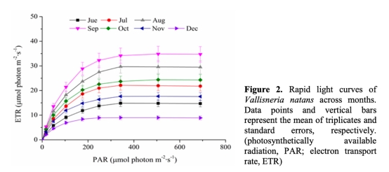 3. 快速光曲線(RLC):測量苦草葉片的光合電子傳輸速率(ETR),顯示光合能力隨生長階段變化,峰值在9月。數據來自圖2。研究意義是關聯植物光合活性與微環境變化,證明光合能力驅動O2和pH梯度。