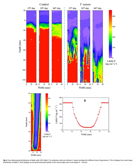 3. DGT-labile P二維分布:Zr-oxide DGT圖像顯示根際labile P分布不均勻,出現(xiàn)低通量區(qū),表明鐵斑塊吸附磷導致局部磷減少。數(shù)據(jù)來自Fig.6。研究意義是可視化根際磷的異質(zhì)性,驗證鐵斑塊作為磷匯的角色。