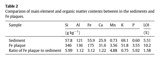 4. 鐵斑塊元素組成:SEM/EDS分析顯示鐵斑塊富集鐵、磷、硅和錳,磷濃度比沉積物高5.92倍。數(shù)據(jù)來自Fig.7和Table 2。研究意義是量化鐵斑塊對磷的富集能力,支持其作為磷庫的功能。
