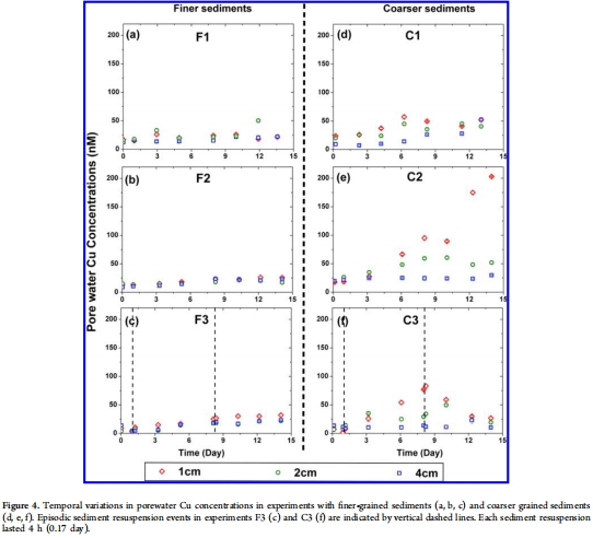 研究意義:這是最直接的證據。數據顯示,在粗顆粒沉積物(C系列)中,增加剪切力顯著提高了[Cu]d和釋放通量;而在細顆粒沉積物(F系列)中,不同水動力條件下的通量相似。再懸浮事件則導致[Cu]t急劇但短暫地升高。這說明水動力對金屬釋放的影響嚴重依賴于沉積物的異質性。