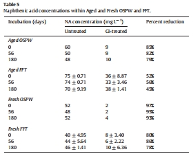 數(shù)據(jù):輻照處理后,新鮮和陳化工藝水及尾礦中的環(huán)烷酸濃度立即顯著下降(新鮮工藝水降低97%,陳化工藝水降低85%)。長(zhǎng)期培養(yǎng)并未導(dǎo)致濃度進(jìn)一步顯著下降。