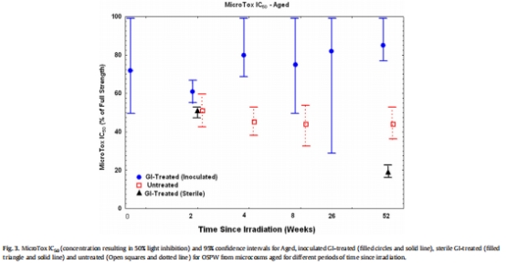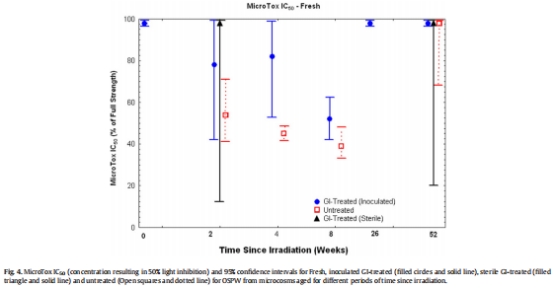 數(shù)據(jù):輻照處理并接種微生物培養(yǎng)4周后,陳化工藝水對(duì)發(fā)光細(xì)菌的毒性顯著降低(IC50從約45%升至80%)。新鮮工藝水在輻照后毒性也立即降低,并在長(zhǎng)期培養(yǎng)后變得基本無(wú)毒。