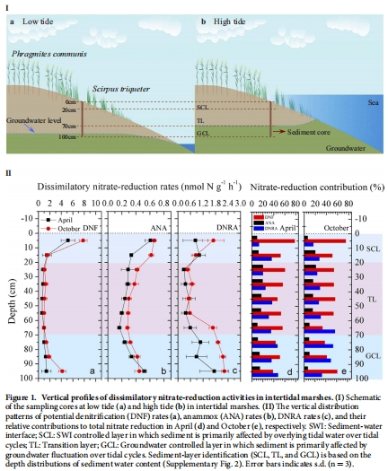 本研究探討了潮汐泵浦效應(tidal pumping)如何促進潮間帶沼澤中的異化硝酸鹽還原(Dissimilatory Nitrate Reduction)過程。潮間帶沼澤由于周期性的潮汐漲落,其生物地球化學過程深受影響。本研究以長江河口潮間帶為研究對象,首次綜合運用同位素示蹤技術(15N)和分子生物學方法,揭示了三種主要的異化硝酸鹽還原途徑——反硝化作用(Denitrification, DNF)、厭氧氨氧化(Anammox, ANA)和異化硝酸鹽還原為銨(DNRA)——的活性和相關功能微生物群落的垂直分布特征。研究發現,硝酸鹽還原活性和功能菌的豐度在沉積物-潮水界面(SWI)和潮汐驅動的地下水波動層(GCL)均顯著增強。這一分布模式表明,潮汐泵浦(即潮汐漲落驅動的水體和溶質在沉積物中的往復運動)是維持潮間帶高強度硝酸鹽還原的關鍵機制。該機制進一步得到了孔隙水營養鹽剖面、潮汐周期內氮組分動態變化以及潮汐模擬實驗的支持。本研究證實了潮汐在調控異化硝酸鹽還原途徑動態中的核心作用,為理解潮間帶沼澤乃至全球氮循環提供了新的視角。
