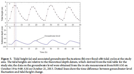 野外采樣與監測:在長江河口崇明島東灘的潮間帶(圖1I),于2013年4月(春季)和10月(秋季)采集深達100厘米的沉積物柱樣。同時,在連續50小時的春潮期間,監測地下水位波動(圖5)和各深度孔隙水營養鹽(NH4+, NOx-)的時序變化(圖6)。