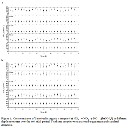 數據:地下水位隨潮汐漲落而明顯波動,且相對于潮位變化存在約1小時的滯后(圖5)。在沉積物表層和80厘米深度,孔隙水中的NH4+和NOx-濃度在潮汐周期內表現出顯著的時序性變化(圖6)。