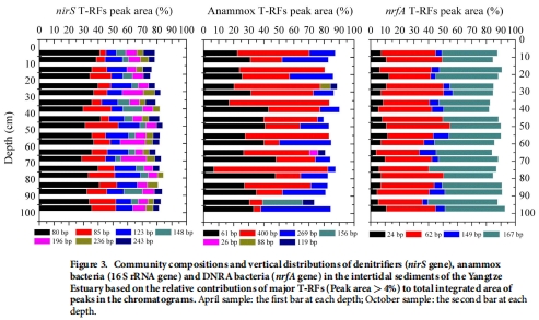 通過高通量測序和末端限制性片段長度多態性分析(T-RFLP) 研究功能微生物(基于 nirS(反硝化)、16S rRNA(厭氧氨氧化)、nrfA(DNRA)基因)的群落結構和垂直分布(圖3)。