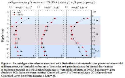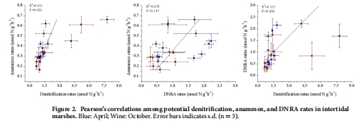 數據:功能基因(nirS, 厭氧氨氧化菌16S rRNA, nrfA)的豐度垂直分布與對應的過程速率(DNF, ANA, DNRA)高度一致,也呈現出雙峰模式。統計顯示,基因豐度與過程速率之間存在顯著正相關關系。