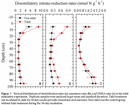 數據:在室內模擬實驗中,與有潮汐作用的處理組相比,無潮汐作用的對照組其深度積分后的DNF, ANA和DNRA速率顯著下降了26.8%-45.2%。