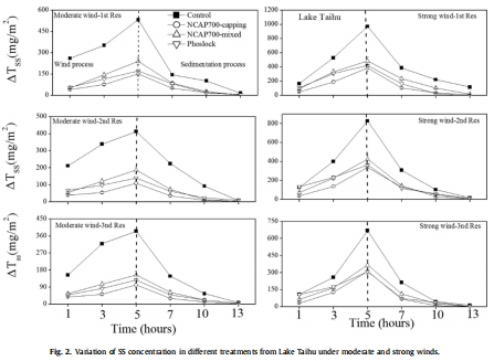數據:與對照組相比,所有材料處理組均顯著降低了上覆水中的SS濃度和沉積物的侵蝕深度。其中,NCAP700覆蓋處理的SS濃度和侵蝕深度最低,表明其穩定沉積物表面的效果最好。強風條件下的SS濃度和侵蝕深度均高于中等風力條件。
