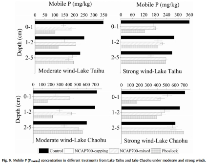 數據:經材料處理后,沉積物中的活性磷(Pmobile)含量顯著降低,而鈣結合磷(Ca-P)和殘渣磷(Res-P)等穩定形態磷的比例顯著增加。Phoslock®在表層(0-2厘米)沉積物中的Pmobile降低效果最明顯。