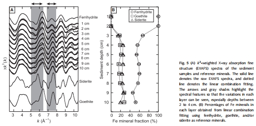 采用體相Fe K-edge EXAFS分析沉積物整體鐵礦物組成(如水鐵礦、針鐵礦、菱鐵礦的比例)(圖5)。