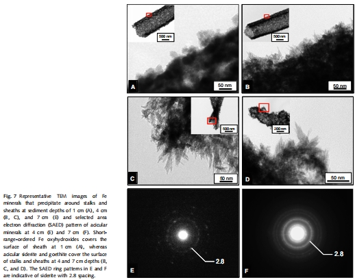 數據:TEM圖像顯示,在1厘米深度,生物莖鞘表面覆蓋的是無定形、球狀的水鐵礦顆粒;而在3厘米以下深度,莖鞘表面則被針狀(acicular)的針鐵礦和菱鐵礦晶體所包裹。SAED衍射環證實了這些晶體的物相。