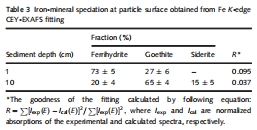數據:通過體相EXAFS線性組合擬合,定量給出了不同深度沉積物中水鐵礦、針鐵礦和菱鐵礦的相對比例。結果顯示,水鐵礦在整個剖面(1-10厘米)都占主導地位(>46%),但針鐵礦和菱鐵礦的比例在3厘米以下深度有所增加。