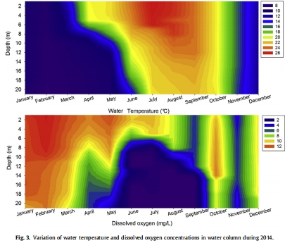 監測水體垂直剖面:測量水溫、溶解氧(DO)、總磷(TP)的時空變化(圖2, 3, 4),以確定熱分層、缺氧發生的位置和程度以及底層水磷的分布特征。