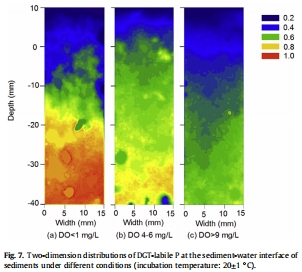 數據:圖5顯示,夏季沉積物表層(0-5 cm)的DGT活性磷濃度顯著高于冬季,并且在SWI附近存在高度的空間異質性。圖7的室內實驗進一步證明,在缺氧條件下(DO < 1 mg/L),上覆水中的活性磷濃度(~0.15 mg/L)遠高于中氧和高氧條件。