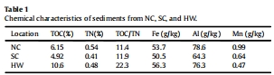 分析沉積物的基本性質,如總有機碳(TOC)、總氮(TN)、Fe、Al、Mn含量等(表1)。
