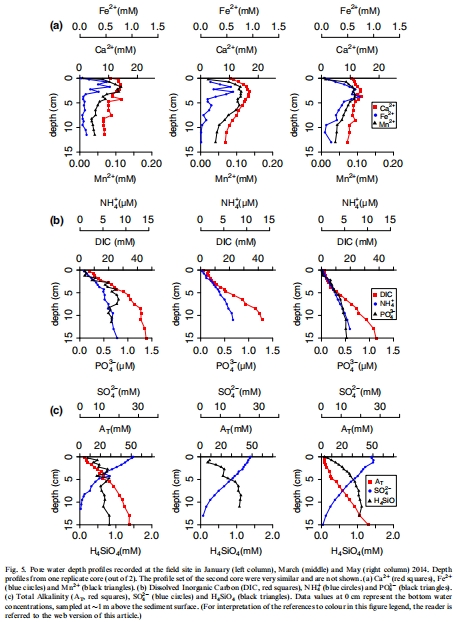 孔隙水化學數據:包括溶解無機碳(DIC)、NH4+、PO4^3-、SO4^2-、Ca2+、Fe2+、Mn2+和堿度(AT)的深度剖面,如圖5所示。這些數據揭示了e-SOx誘導的溶質積累(如Ca2+和Fe2+在亞氧化區(qū)富集)和消耗模式。研究意義在于展示了e-SOx如何促進碳酸鹽溶解和硫循環(huán)改變,例如,Ca2+的富集反映了酸性條件下礦物的溶解,而SO4^2-的剖面顯示了e-SOx導致的凈生產。